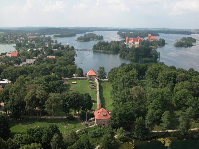 Trakų pilis pastatyta XIV a. Gedimino sūnaus Kęstučio iniciatyva. Tai buvo pirmasis pilių kompleksas Naujuosiuose Trakuose, susidedantis iš pusiasalio pilies ir Galvės ežero salos pilies. XIV a pilį sudarė gotikiniai rūmai ir donžonas – gyvenamasis bokštas. Šiuos pastatus supo gynybinė siena. Jau valdant Vytautui, po Žalgirio mūšio pilis neteko strateginės reikšmės. XV a. ji buvo LDK kunigaikščių rezidencija ir iškilmingų priėmimų bei pokylių vieta. XVI a. salos pilis paversta “bajorų kalėjimu” – čia buvo kalinami kilmingi karo belaisviai. Trakų pilies rūmai atstatyti 1955-1962 pagal architekto Bronislovo Krūminio projektą. Dabar juose įkurtas Trakų istorijos muziejus. Pilies kompleksas, kurio plotas 1,8 ha, užima beveik visą salą. Su miestu ją jungia medinis tiltas. Kompleksą sudaro dvi dalys – keturkampė rūmų bei trapecinė priešpilio. Abi jas supa gynybinė siena su bokštais. Sienos sumūrytos iš eilėmis dėtų ir kalkių skiediniu surištų akmenų, mūras išlygintas plytų intarpais. Dabar pilis atstatyta ir yra vienas populiariausių Lietuvoje turistų lankomų objektų; pilyje vyksta įvairios šventės, veikia archeologinė ir istorinė ekspozicijos.